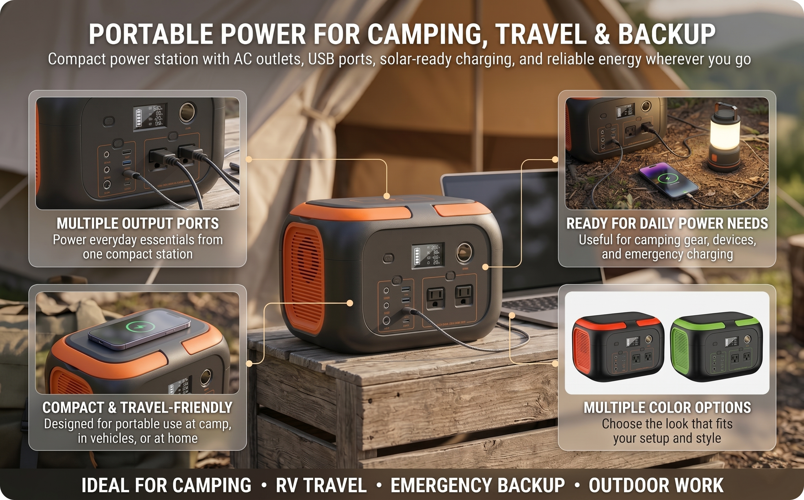 Camping trips, RV travel, outdoor adventures, home backup during outages, emergency preparedness, remote work setups, and road trips.