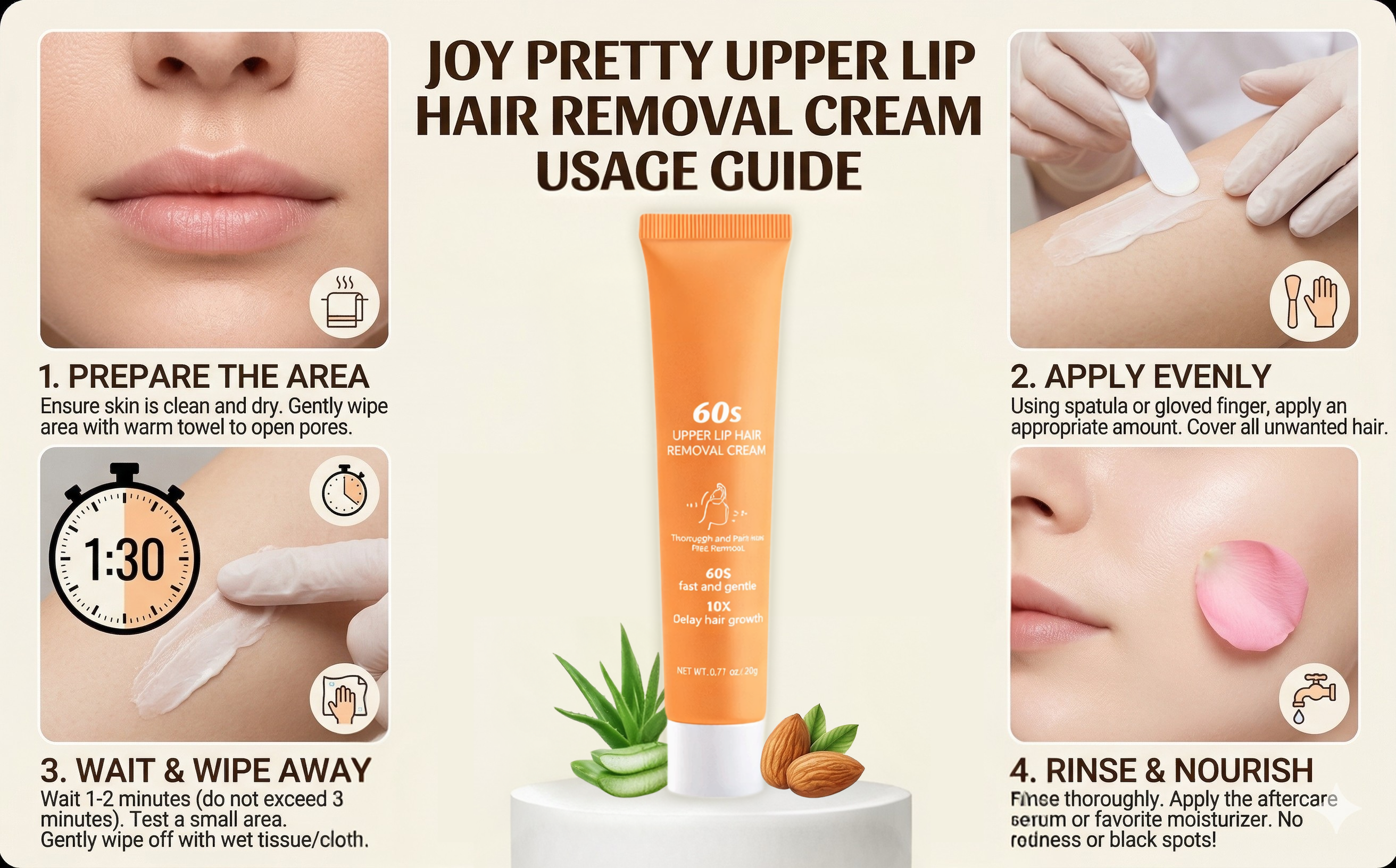 Enriched with high-concentration sweet almond oil and aloe vera extract, our formula not only removes unwanted hair but also whitens and nourishes your skin. These natural ingredients soothe and hydrate, leaving your skin soft, moisturized, and smooth after each use. Whether you're targeting your underarms, lip, arms, or legs, our versatile cream provides a supple and smooth finish every time.