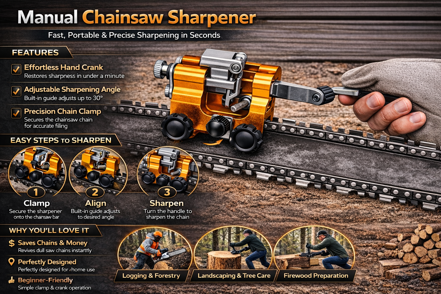 A manual chainsaw sharpener is a handheld maintenance tool designed to restore the cutting edge of chainsaw chains by precisely filing each tooth to its correct angle. It solves the most common chainsaw problem, slow, rough, and unsafe cutting caused by dull chains, without requiring electricity, workshop equipment, or technical skill.
