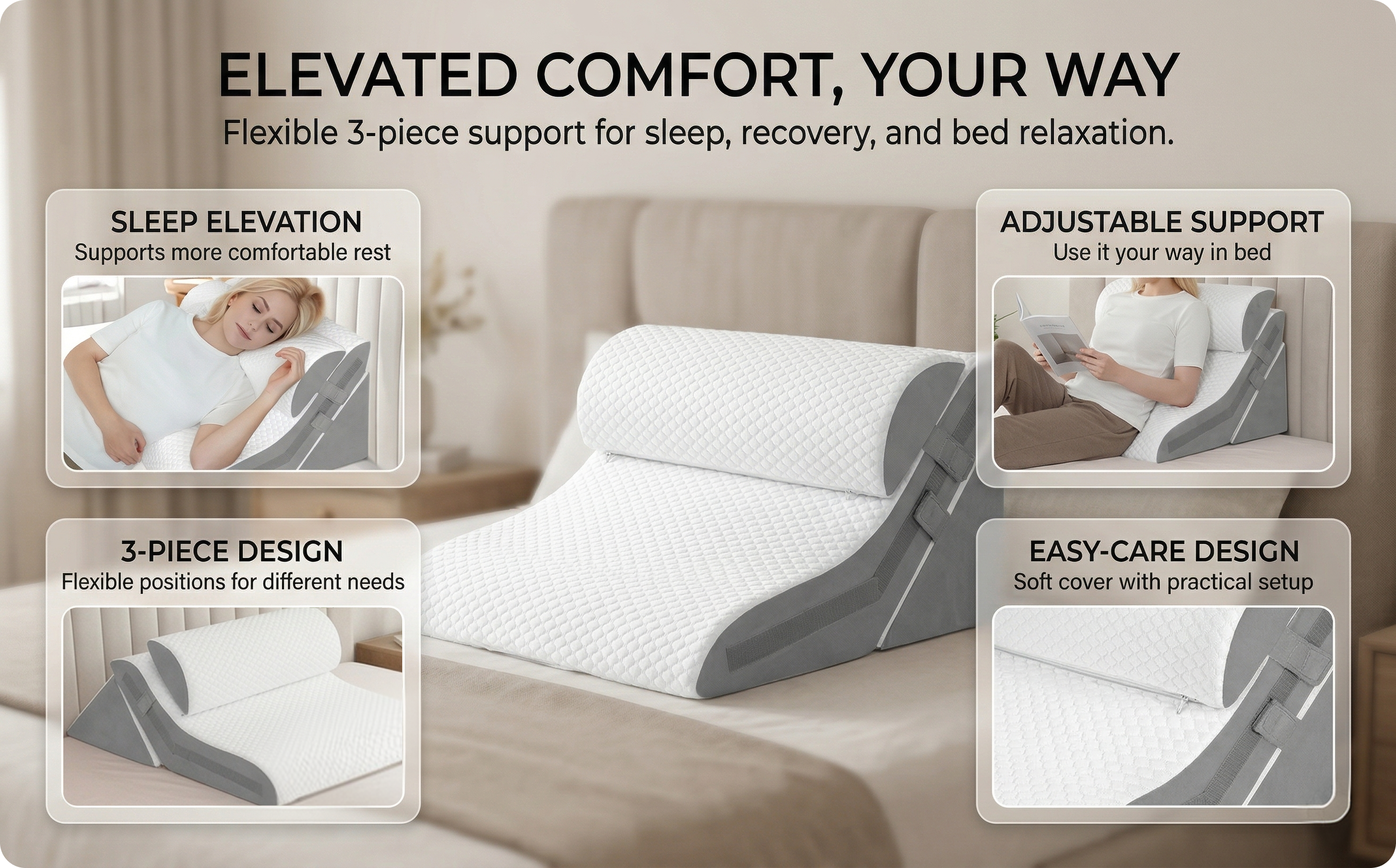 Sink into the kind of support your body actually looks forward to at the end of the day. This adjustable wedge pillow is made for anyone who wants easier breathing, gentler sleep positioning, and more comfort while resting, reading, or recovering in bed. Its 3-piece design lets you raise your head, back, or legs to match the moment instead of forcing your body into one fixed angle. For reflux sufferers, snorers, and anyone healing after surgery, it brings flexible comfort that ordinary single-piece wedges can’t match.