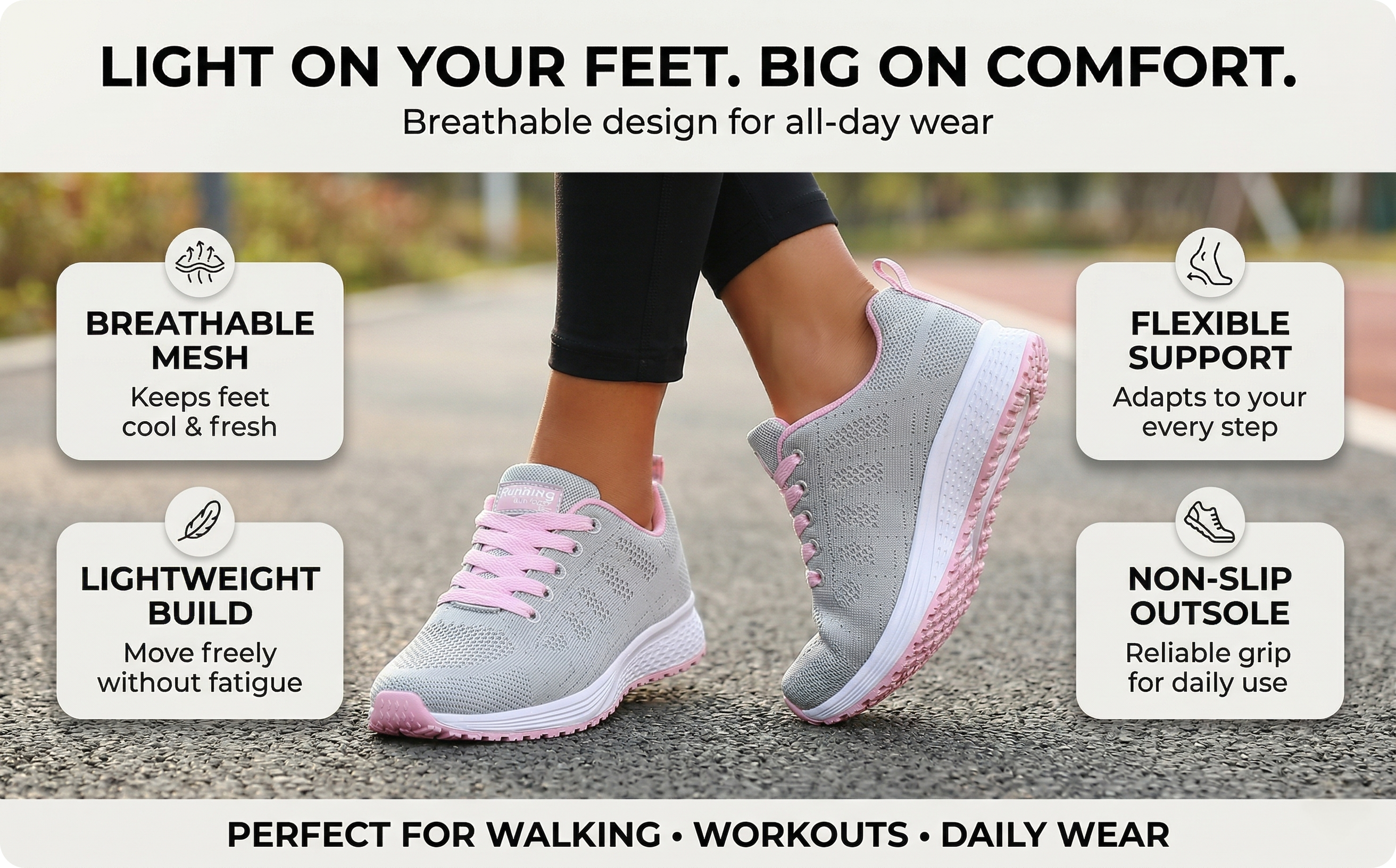 Step into comfort and style with the Women's Breathable Mesh Sneakers. Designed for active women who value both performance and aesthetics, these sneakers are perfect for daily wear, workouts, or casual outings. The lightweight mesh fabric ensures your feet stay cool and comfortable, while the lace-up design provides a secure fit. Whether you're hitting the gym or running errands, these lightweight women's tennis shoes offer the support and flexibility you need.