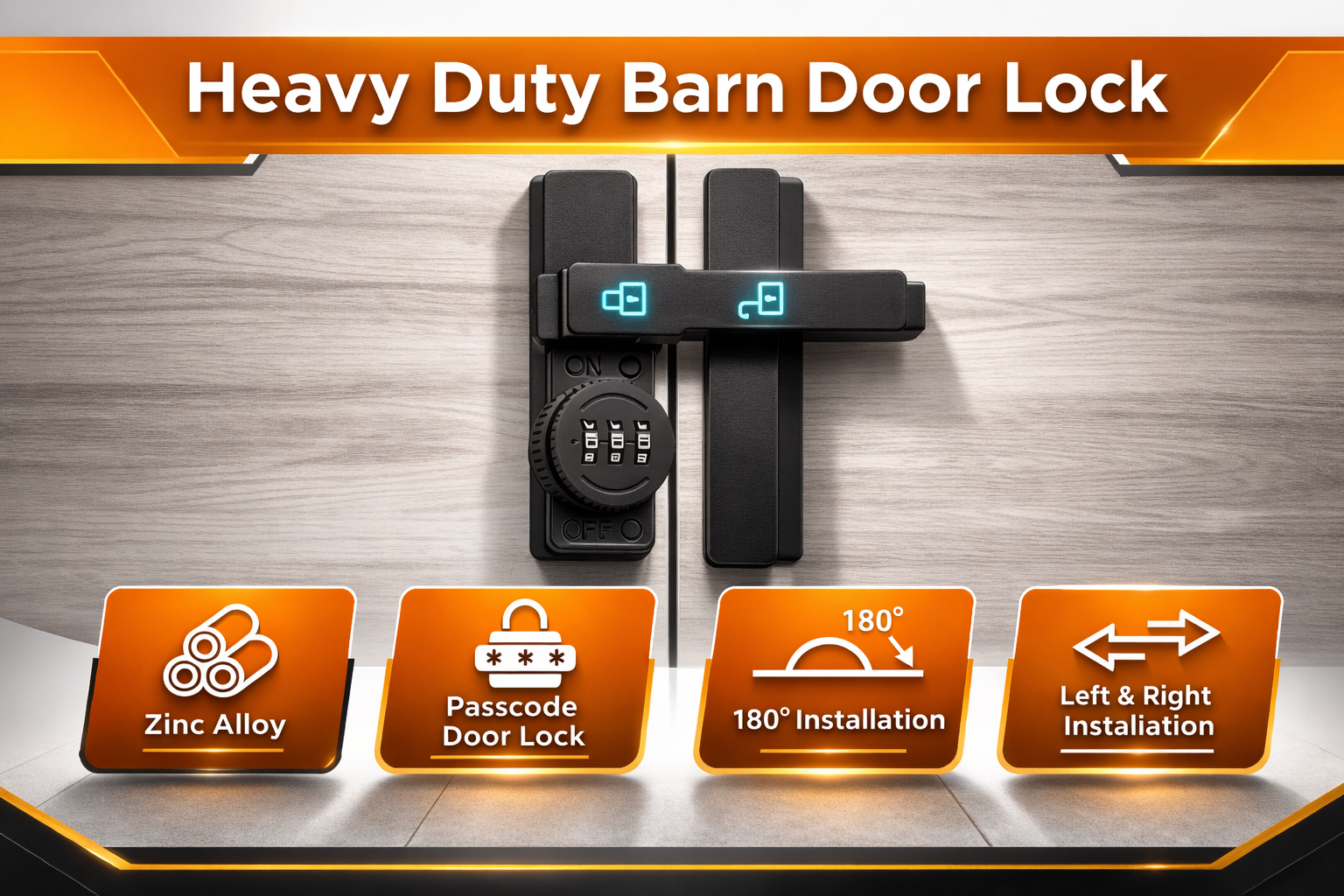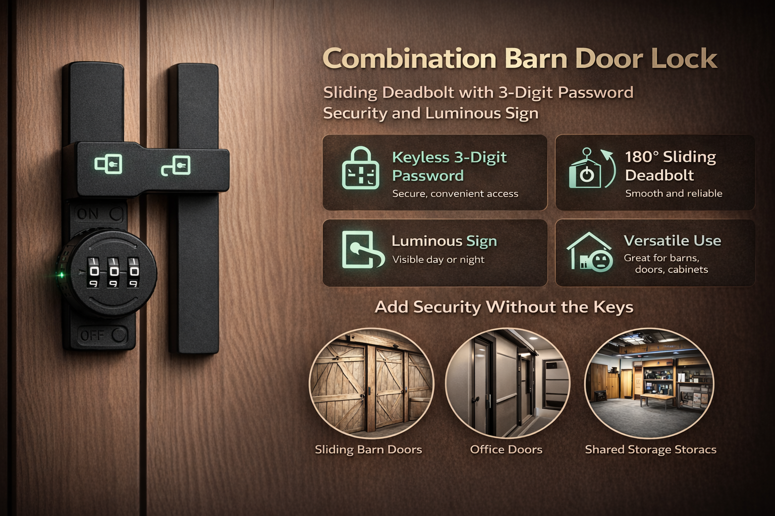 Secure your home or office with confidence using this combination barn door lock. Designed with a 3-digit password system, it eliminates the need for keys while ensuring reliable protection. The 180° sliding deadbolt provides smooth locking, while the luminous indicator makes it easy to use even at night. Compact, durable, and versatile, this password door lock is perfect for barns, windows, sliding doors, and cabinets where extra security is needed.