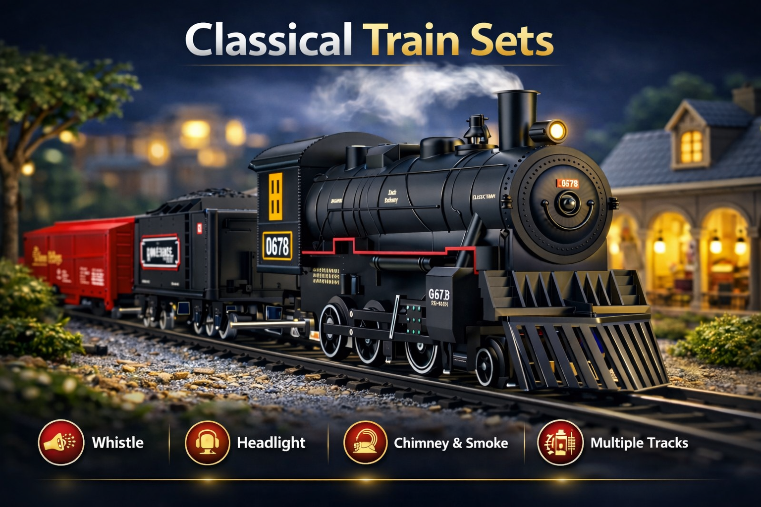 Bring the timeless charm of a Classical Battery Operate Electric Railway into your home with this incredible Train Steam Locomotive Set. This exciting train set combines innovative technology with nostalgic appeal, providing an unforgettable experience for children and adults alike. It features realistic light and sound effects to elevate the train experience and immerse you in a world of adventure.