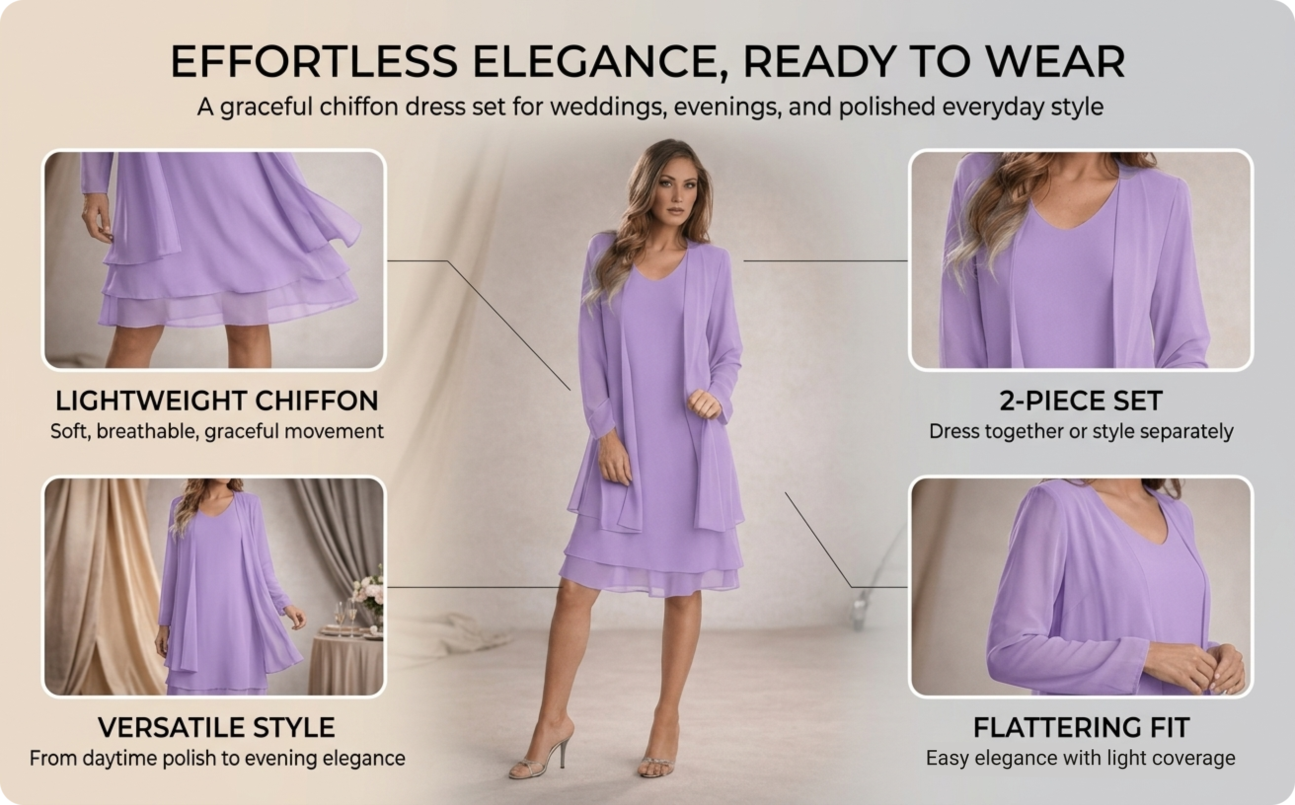 Step into effortless sophistication with this beautifully coordinated chiffon dress set designed for women who want style without the stress. This flowing two-piece dress set pairs a graceful dress with a lightweight cardigan for a polished look in seconds. Whether you're dressing for a wedding or an evening out, it delivers comfort, elegance, and versatility in one outfit. The soft chiffon fabric moves with you, creating a flattering silhouette that feels as good as it looks. Perfect for modern women who want timeless charm with minimal effort.