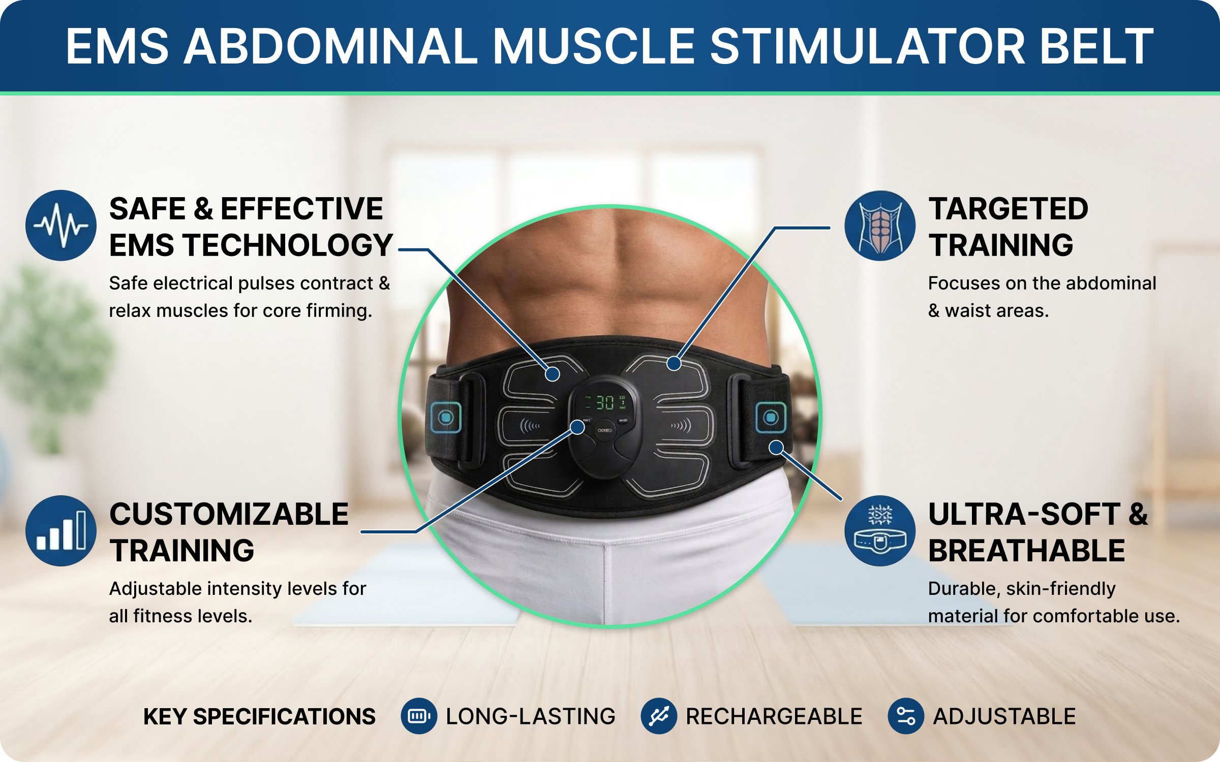 Achieve a stronger, more defined core with this EMS abdominal toning belt, a portable and powerful muscle stimulator that helps tone, strengthen, and shape your abs anytime, anywhere. Using advanced Electrical Muscle Stimulation (EMS) technology, it sends gentle pulses to activate your muscles, simulating real workouts without physical strain. Compact, rechargeable, and easy to use, it’s the perfect fitness companion for both beginners and pros.