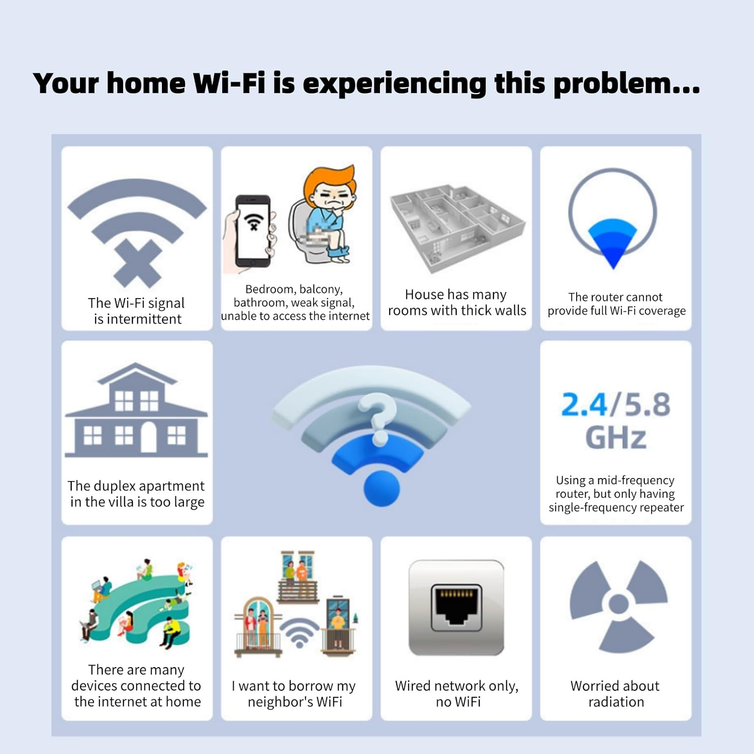 A dual band WiFi extender is a plug-in device that expands your router’s signal, improves coverage, and helps eliminate weak WiFi zones so you can enjoy a faster and more stable connection throughout your home. This WiFi signal booster solves slow speeds, buffering, and dropped connections by extending your existing network into areas your router cannot reach.