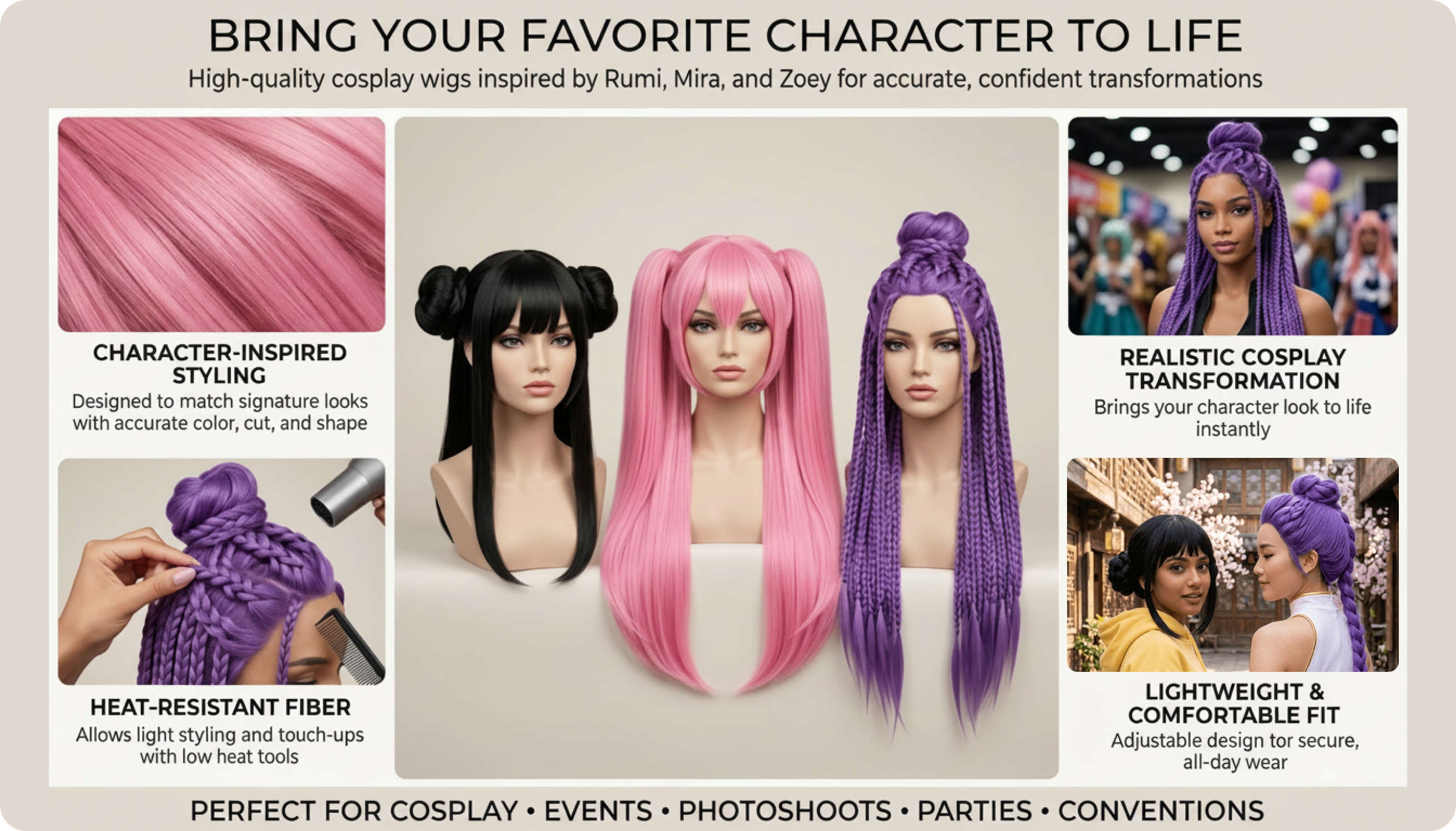 Slip into the spotlight and bring your favorite idols to life with this anime cosplay wig designed for Rumi, Mira, and Zoey fans. Whether you're heading to a convention or creating content, this Kpop cosplay wig delivers vibrant style and character accuracy that turns heads instantly. Crafted with high-quality, heat resistant wig fibers, it lets you style confidently without damage. Comfortable, lightweight, and easy to wear, it’s perfect for beginners and seasoned cosplayers alike. Elevate every look with a wig that captures the true essence of your favorite characters.