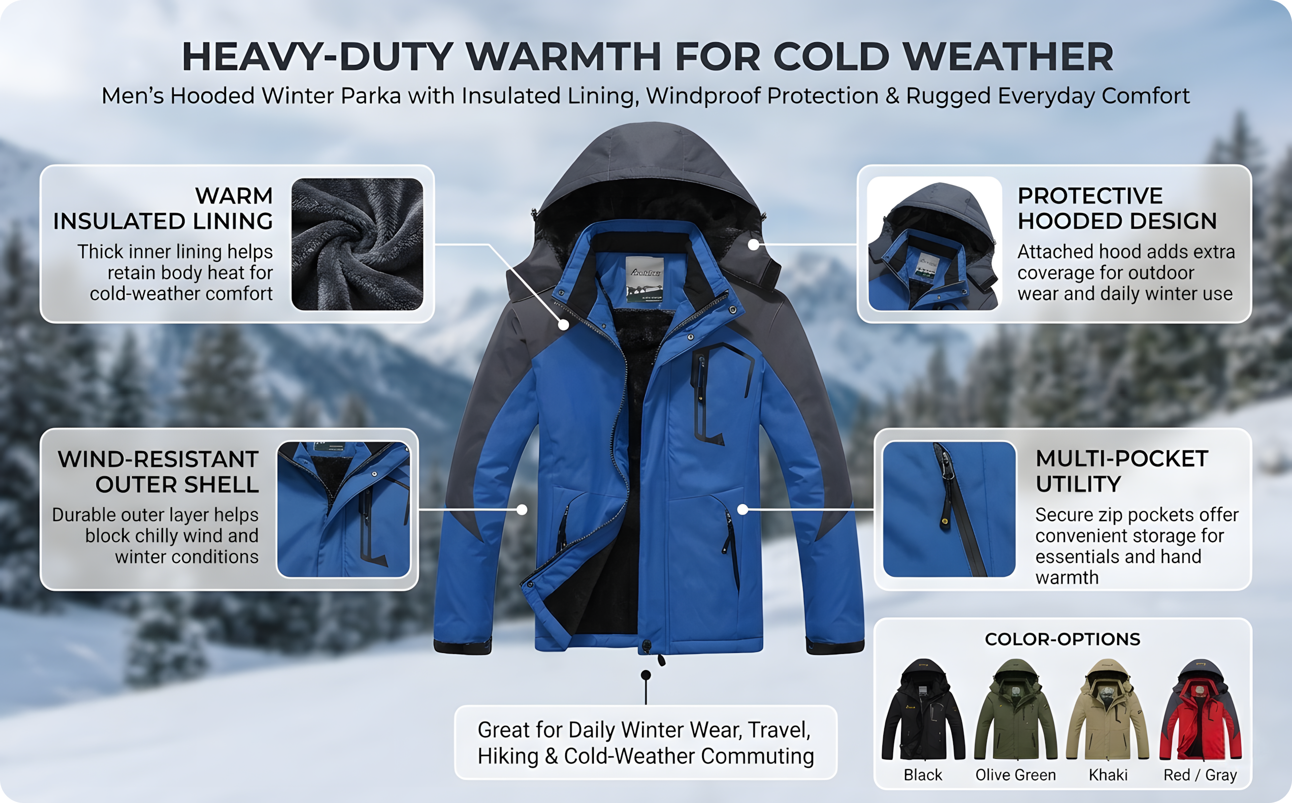 Unlike standard winter jackets, this parka is engineered for performance and durability in colder climates. The combination of a windproof winter jacket design and superior insulation ensures consistent warmth without bulk. Its versatile style transitions easily from outdoor adventures to daily wear, giving you more value in one essential piece.