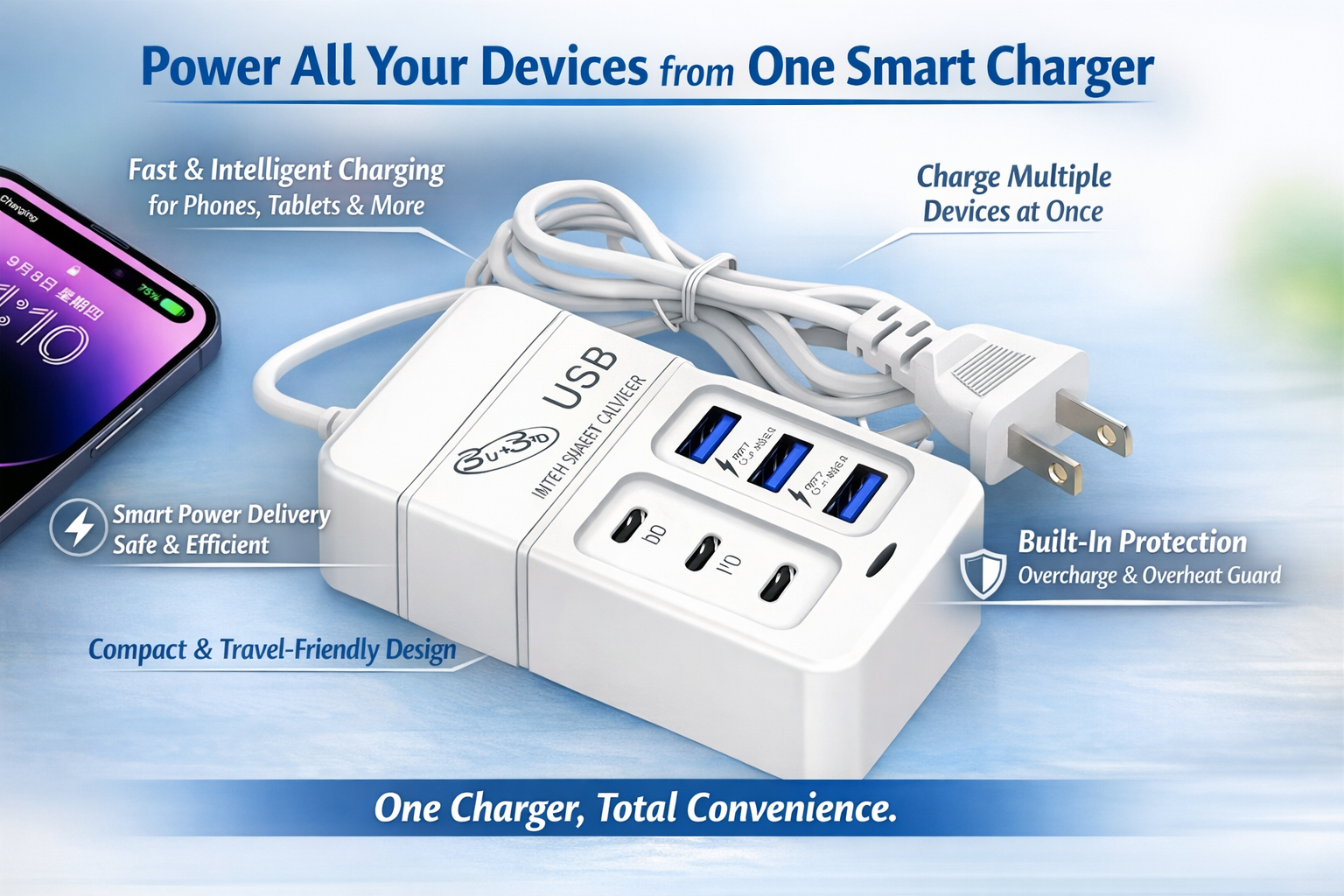 Why This Multi-Port USB Wall Charger Will Simplify Your LifeIf you're tired of juggling different chargers and waiting for your devices to power up, this multi-port charger is the answer. Whether you're working from home, studying, or traveling, this charger ensures your devices are always powered and ready to go. Its compact design makes it easy to slip into your bag or place on your desk, providing convenience and functionality no matter where you are.