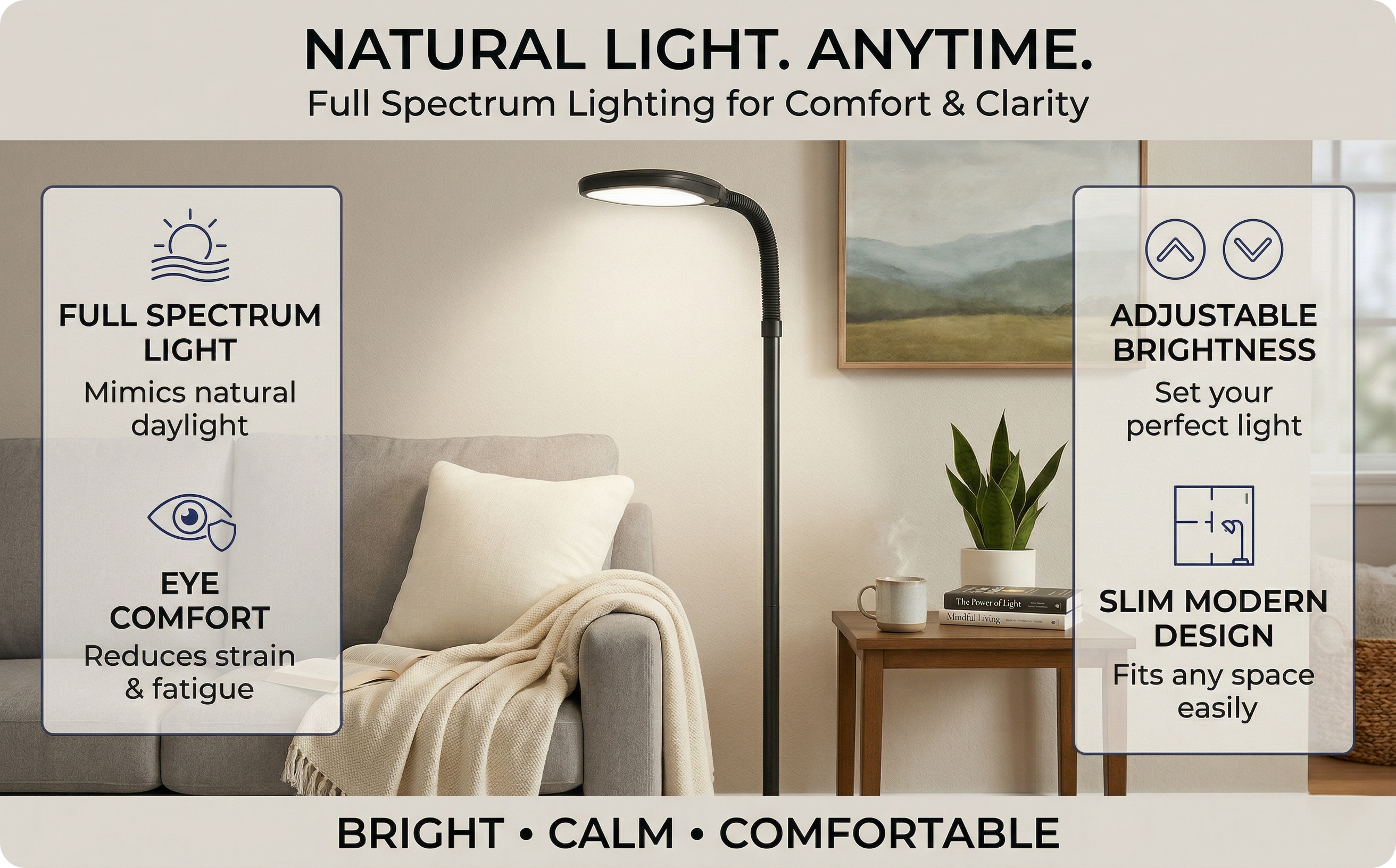Why Choose Our Full Spectrum LED Floor Lamp 60" – Sunlight Therapy & Reading Light for Eye Comfort