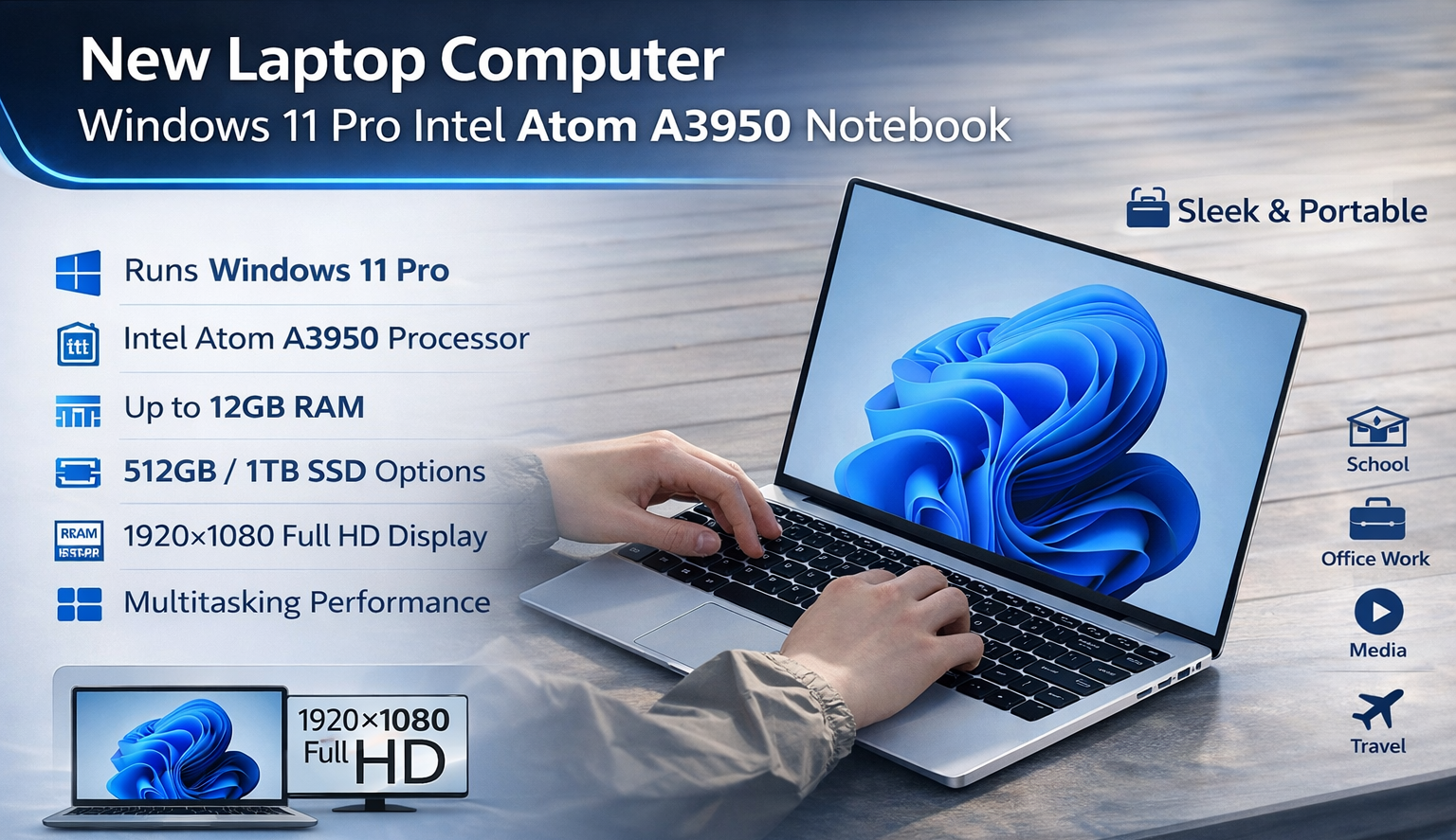Power through work or casual play with this Windows 11 Pro laptop powered by an Intel Atom A3950 processor. With up to 12 GB RAM and options for 512 GB to 1 TB SSD, this notebook balances performance and capacity. The 1920×1080 Full HD display delivers crisp visuals for productivity, entertainment, or browsing.