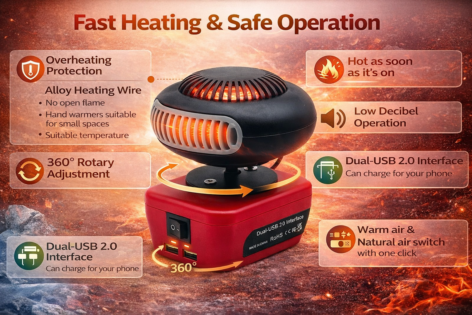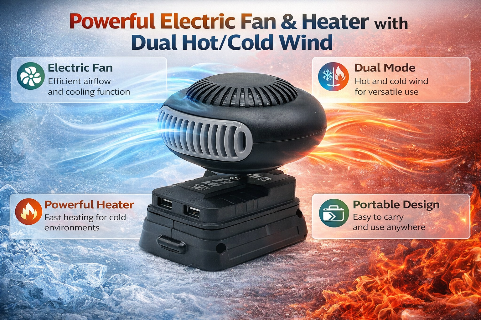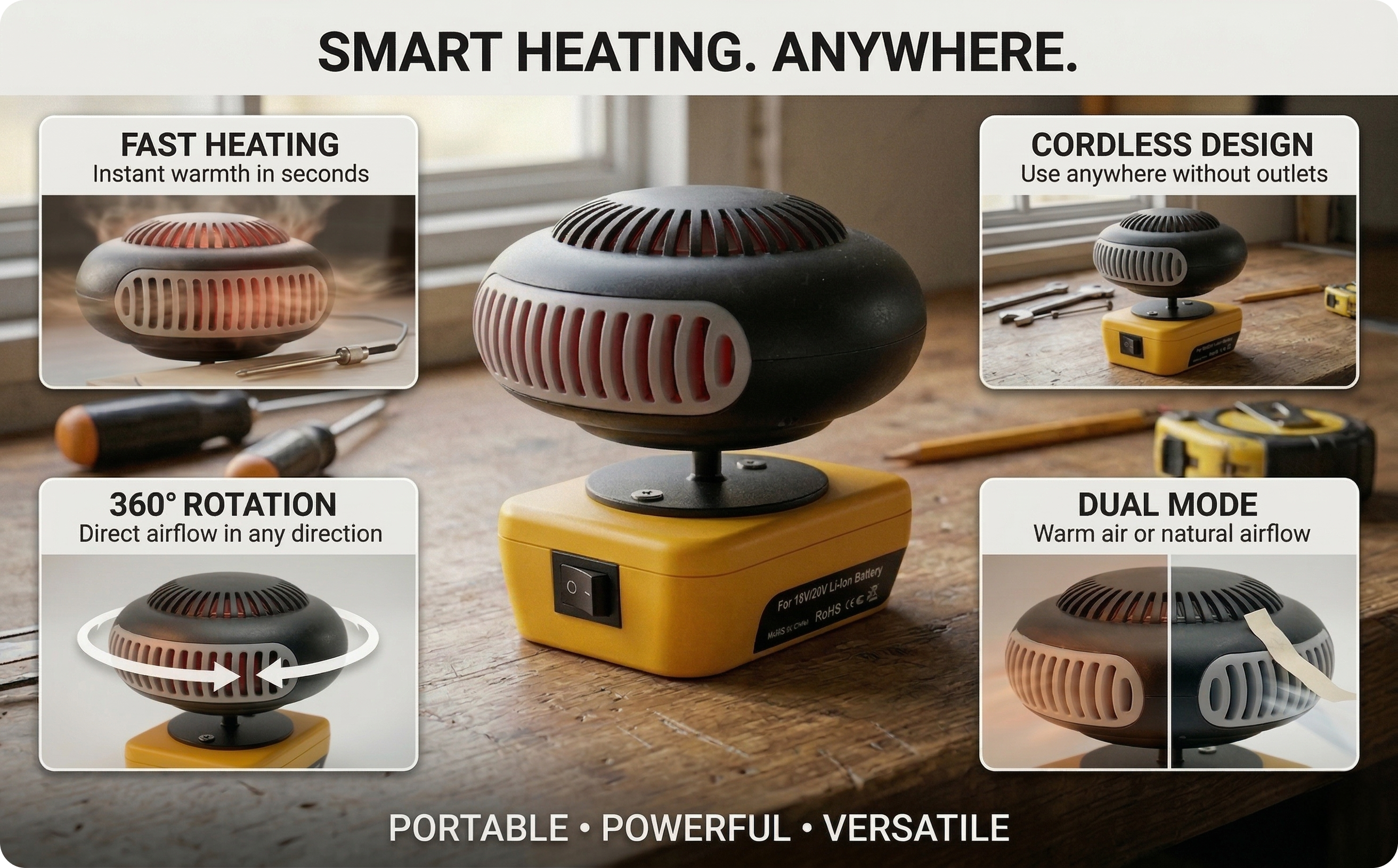 This portable warm air blower delivers fast heating and strong airflow wherever you work. Designed to run on standard lithium tool batteries, it lets you enjoy warm air or natural airflow on the go without cords or outlets. Its alloy heating wire warms up quickly while the quiet, low noise fan delivers steady performance. With 360 degree rotation, dual USB ports, and two airflow modes, it’s a convenient addition for workshops, garages, outdoor tasks, camping, and cold-weather jobs.