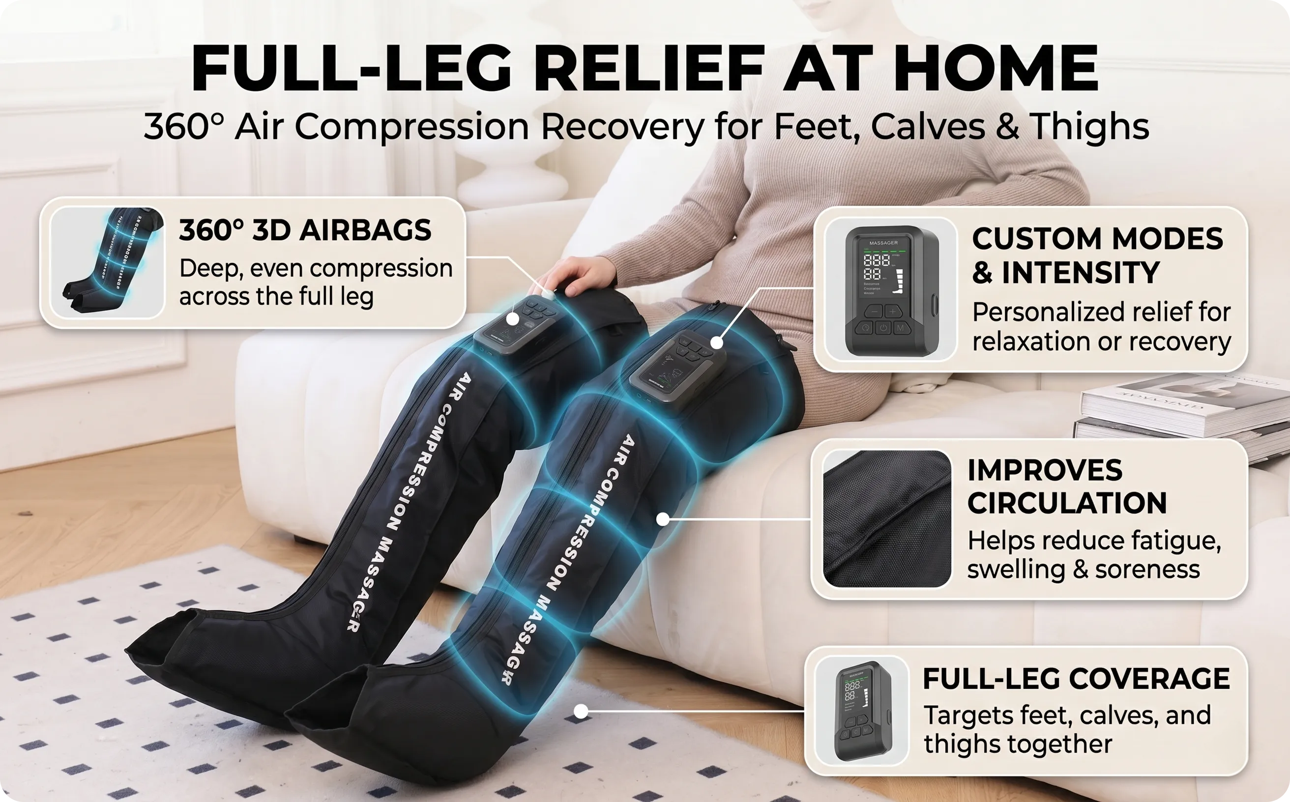 Tired, heavy legs can drain your energy and slow you down. This leg massager is designed for anyone who spends long hours standing, sitting, or training hard, delivering soothing relief right when you need it. Using advanced air compression leg massager technology with 360° 3D airbags, it gently squeezes and releases to boost circulation and reduce fatigue. Unlike basic massagers, it targets your feet, calves, and thighs all at once for a full-leg recovery experience. Whether you're relaxing at home or recovering after a workout, comfort is just a session away.
