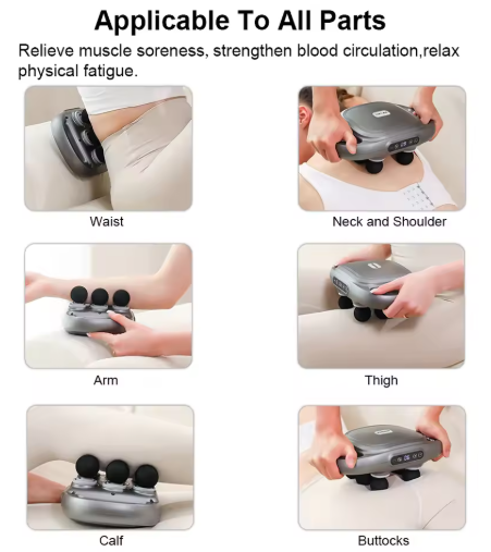 Select a massage head, power on the device, choose your preferred intensity, and gently glide it over the target muscle area for relief.