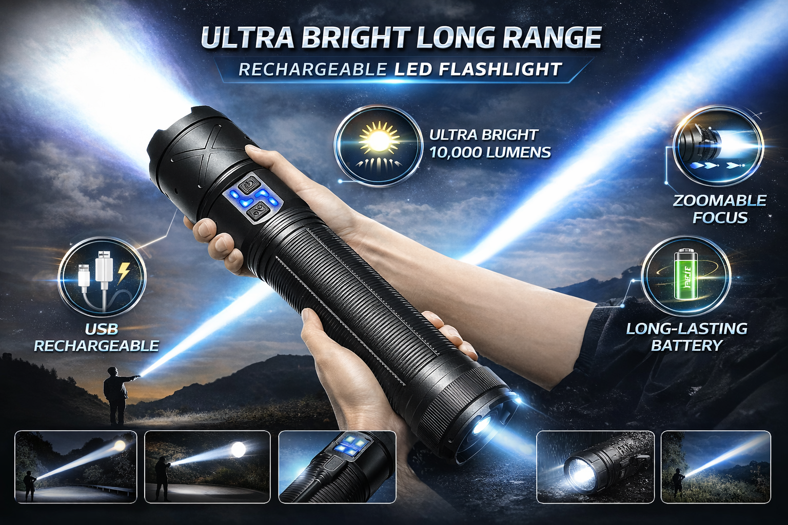 The New Ultra Bright LED Flashlight USB Rechargeable offers a remarkable lighting experience, making it your perfect companion for outdoor adventures. Whether you're camping, fishing, or in need of a reliable work lamp, this flashlight delivers an exceptional long-range beam. Designed for performance, it ensures that you’re never left in the dark, no matter the task or environment.Versatile and Durable Design