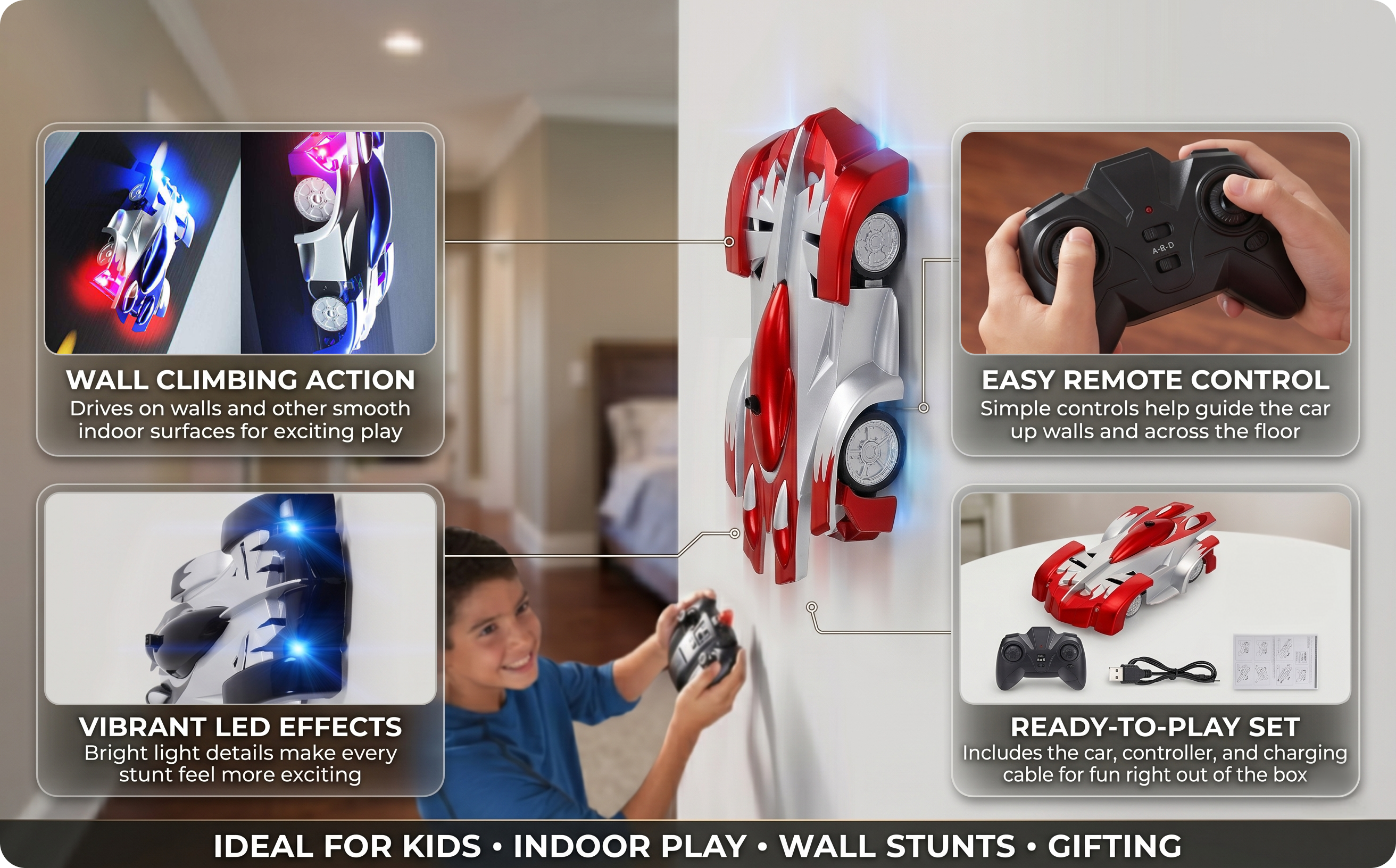 Watch excitement defy gravity with this wall climbing remote control car that races across floors, walls, and even ceilings. Designed for kids and playful adults alike, this innovative RC wall car delivers a thrilling, gravity-defying experience unlike ordinary toy cars. Its powerful suction technology and smooth controls make every ride feel futuristic and fun. Whether it’s indoor racing or creative stunts, this remote control climbing car turns any room into an adventure zone.