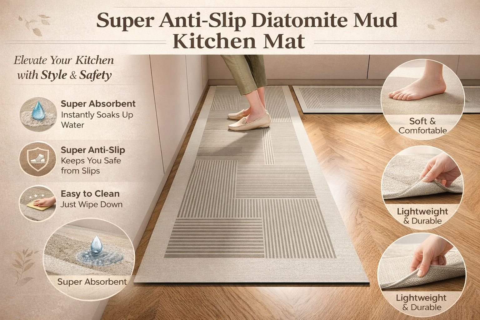 Buy Now and enjoy a cleaner, safer, and more comfortable kitchen experience with the Diatomite Kitchen Mat.
