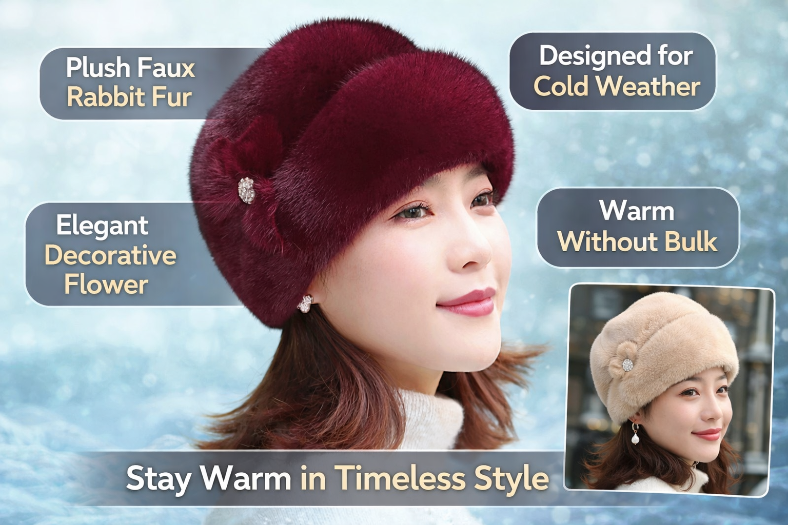Each hat is crafted with care to ensure durability, breathability, and long-lasting softness. The faux rabbit fur texture not only feels incredibly smooth but also helps retain heat efficiently, providing a reliable shield against chilly temperatures.