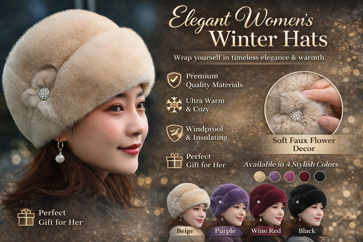 Perfect for middle-aged women or anyone seeking an elegant, fashionable winter accessory, this hat makes a thoughtful gift for loved ones during the holiday season or birthdays.