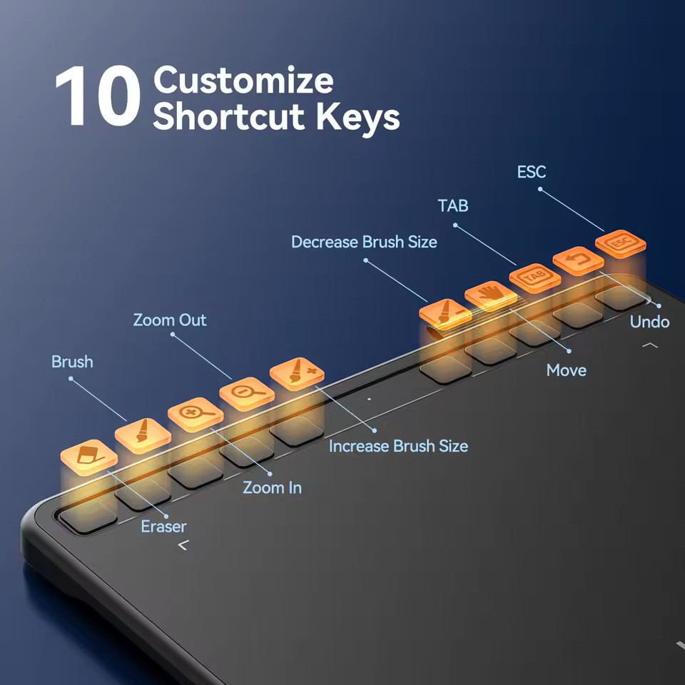 Workflow efficiency: 10 customizable shortcut keys let you map commonly‑used actions (undo, zoom, brush/erase toggle) to speed up creative work.