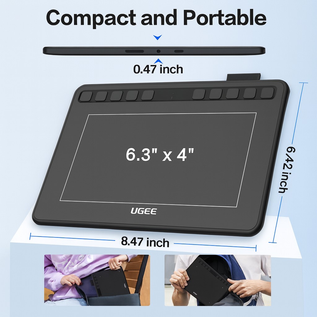 The UGEE S640 is a compact, high‑performance graphic drawing tablet ideal for beginners, hobbyists, and professionals alike. With an active area of approximately 6″ (6.3″ × 4″) and a battery‑free stylus supporting 8,192 levels of pressure sensitivity plus 60° tilt, it offers a true‑to‑life drawing experience. Compatible with Windows, macOS, Chrome OS, Android (via OTG) and Linux, the S640 fits seamlessly into your digital workflow — whether you’re illustrating, photo‑editing, annotating, or online teaching. Its slim and lightweight design makes it especially suited for small desks, mobile setups, or creative work on the go.