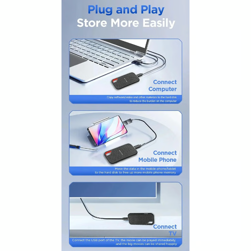 Designed with your productivity in mind, this SSD offers lightning-fast speeds for fast file transfers and secure data storage on the go. Forget waiting for slow hard drives—the compact design fits easily into your pocket or bag, providing convenient storage anywhere you need it. The rugged construction ensures it survives your busiest days, while the plug-and-play feature means no software or setup is required.