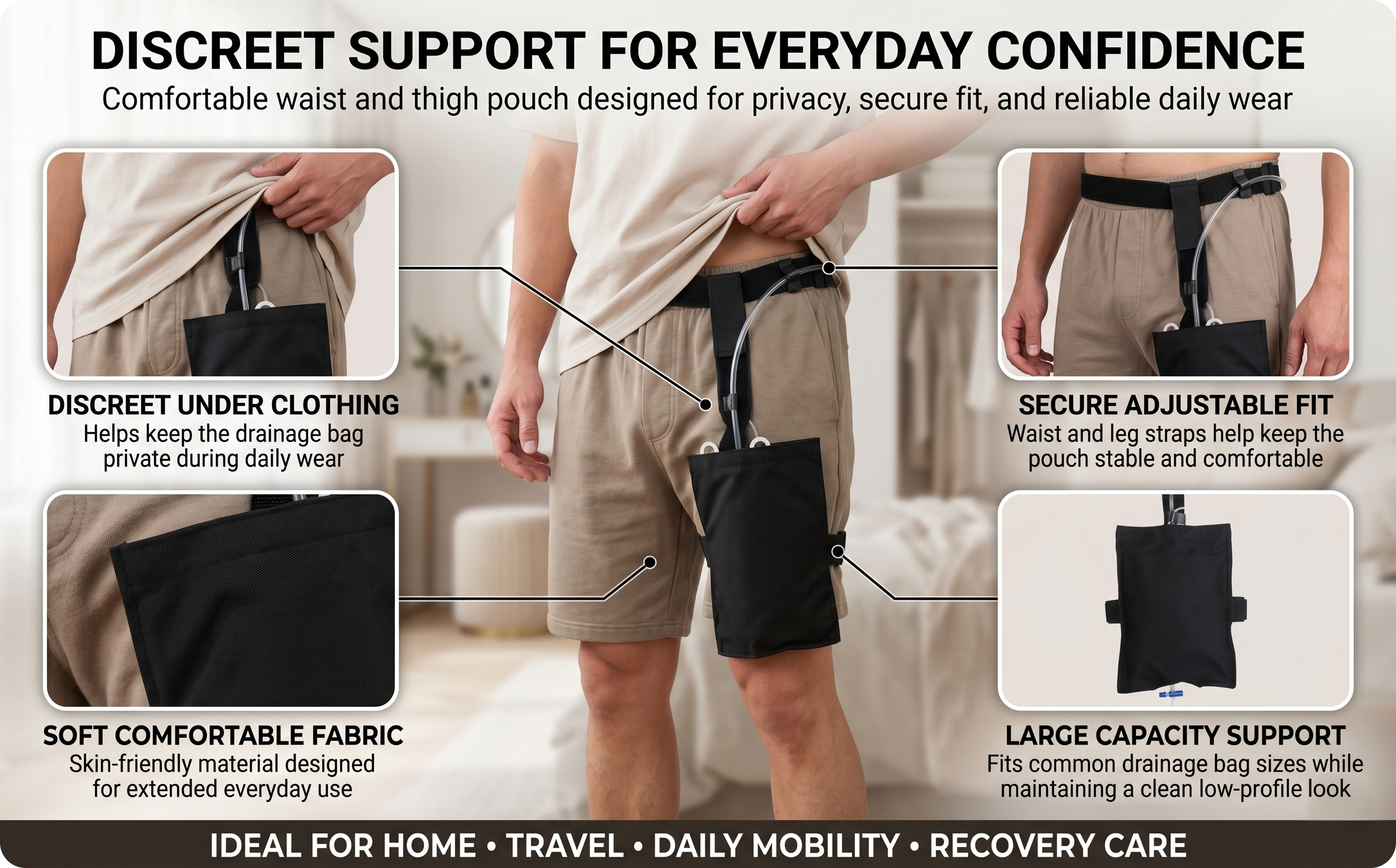 Regain confidence and move freely with this discreet urinary drainage bag holder designed for everyday comfort. Whether you're recovering, managing incontinence, or need long-term catheter support, this lightweight pouch keeps everything secure and out of sight. The breathable design ensures all-day wear without irritation, while the adjustable waist strap offers a snug, personalized fit. Built for dignity and ease, it’s a reliable solution for both home and on-the-go use.