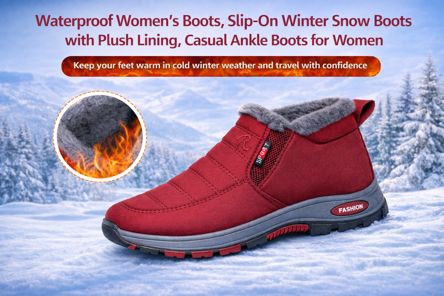 Waterproof Womens Boots, Slip On Winter Snow Shoes with Plush Lining, Casual Ankle Botas for Women