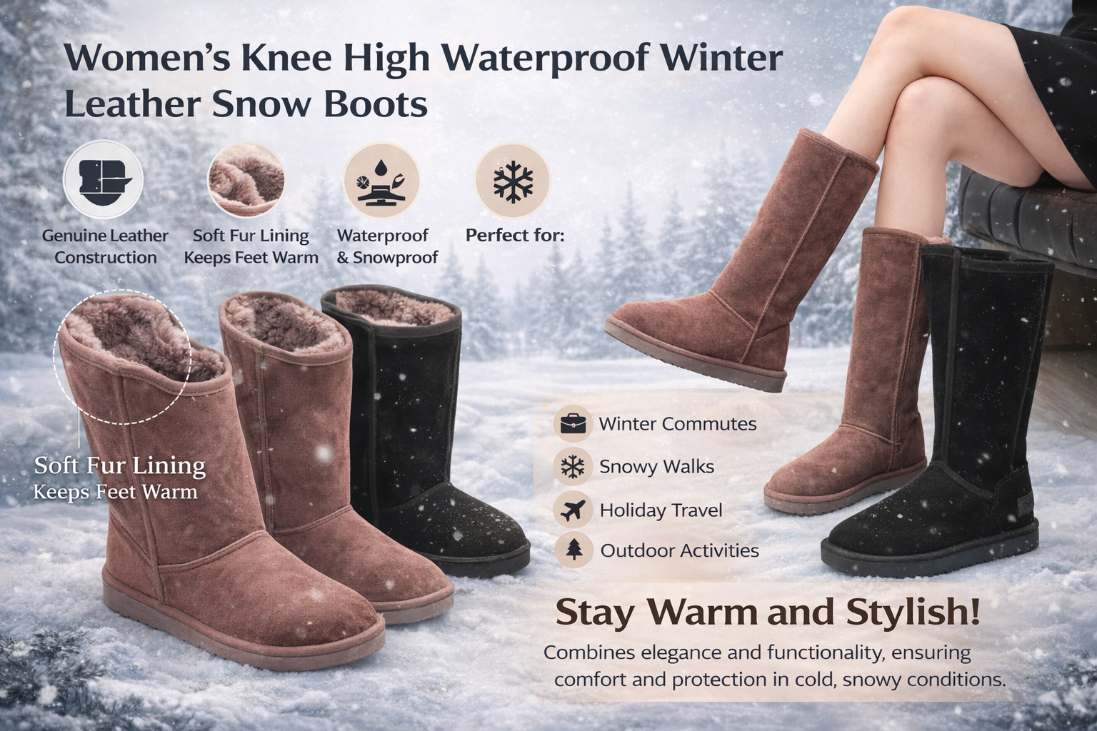 Stay warm and stylish this winter with these women knee high waterproof snow boots. Crafted from genuine leather with a plush fur lining, they provide insulation and comfort in cold conditions. The tall design and durable sole offer both protection and fashion, making them a must have for the season.