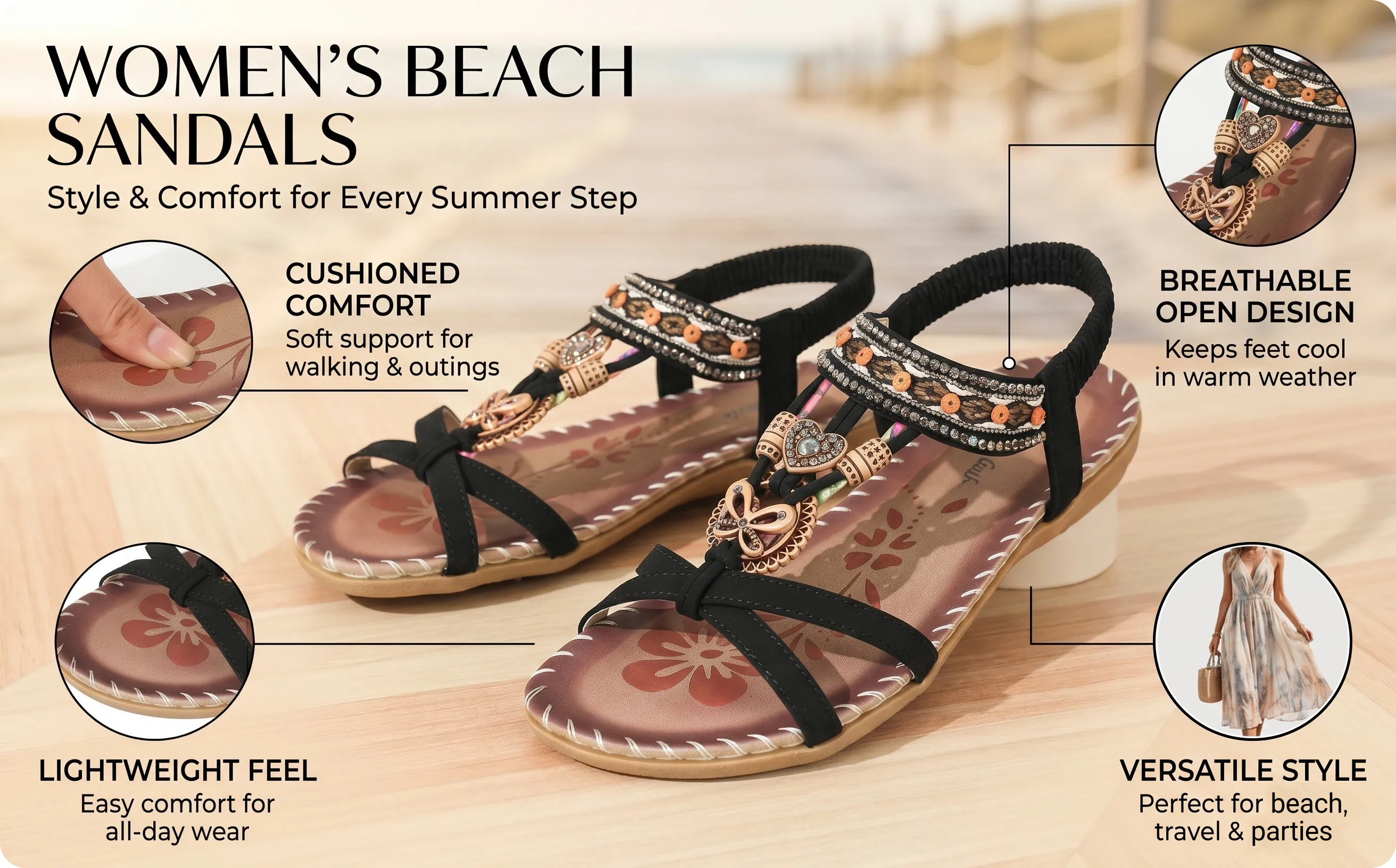 Step into effortless style and comfort with these women’s beach sandals designed for sunny days and lively nights. Crafted for women who love blending fashion with functionality, these sandals offer a lightweight, breathable feel that keeps you moving all day. Whether you're strolling along the shore or heading to a casual gathering, they provide the perfect mix of elegance and ease. With a chic design and cushioned support, these summer casual sandals are your go-to for every warm-weather adventure.