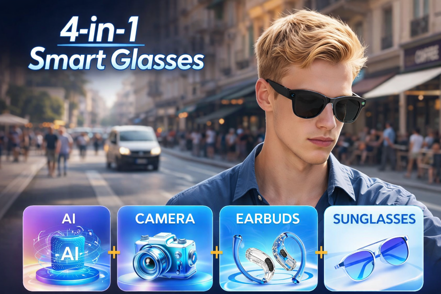 • AI Smart Glasses with Camera for hands-free video recording and photography.